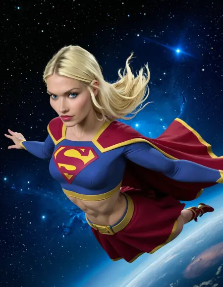 トリガー単語: 1girl, Kara Zor-El, 金髪, 青い目, 締まった肌, 細いウエスト, 腹部露出, 長袖のスーパーガールスーツ、赤いマント
