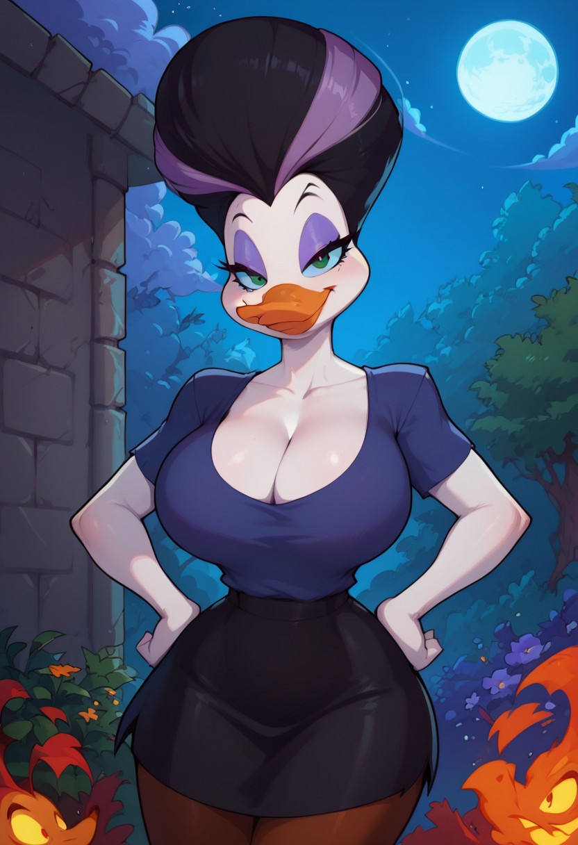 beehive hair, black hair, purple streak in hair, purple eyeshadow, female furry, female duck, white skin, red dress, high collar, brooch, blue sclera, green eyes