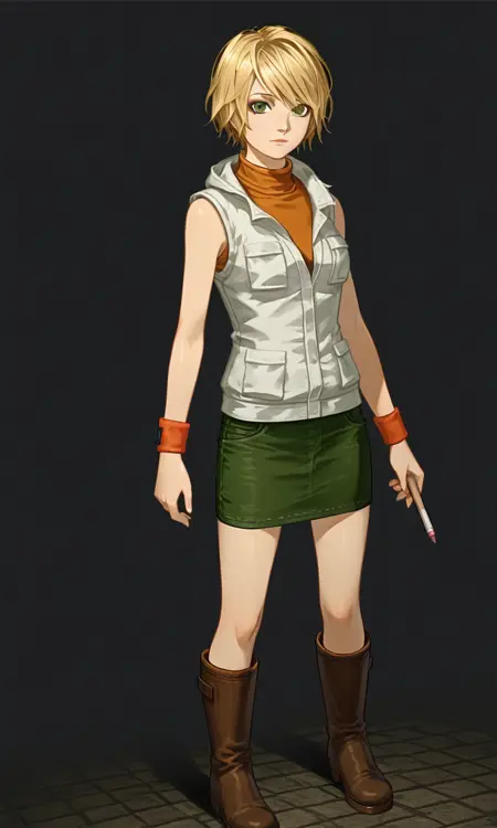 Good, new model, in this model it was trained with basic words since an arduous extension of keywords for its dress style was not necessary, which yes or if they are the following: Heather Mason, Silent Hill The rest are so that they can describe it well: Rubio dyed short hair, cut into layers, white sweater with sleeveless orange cervix, white hooded vest, with four front pockets, sleeveless, green denim miniskirt, high brown boots, bracelet clock (on doll), An orange doll on each arm. For any questions they only write to me or leave a comment, greetings
