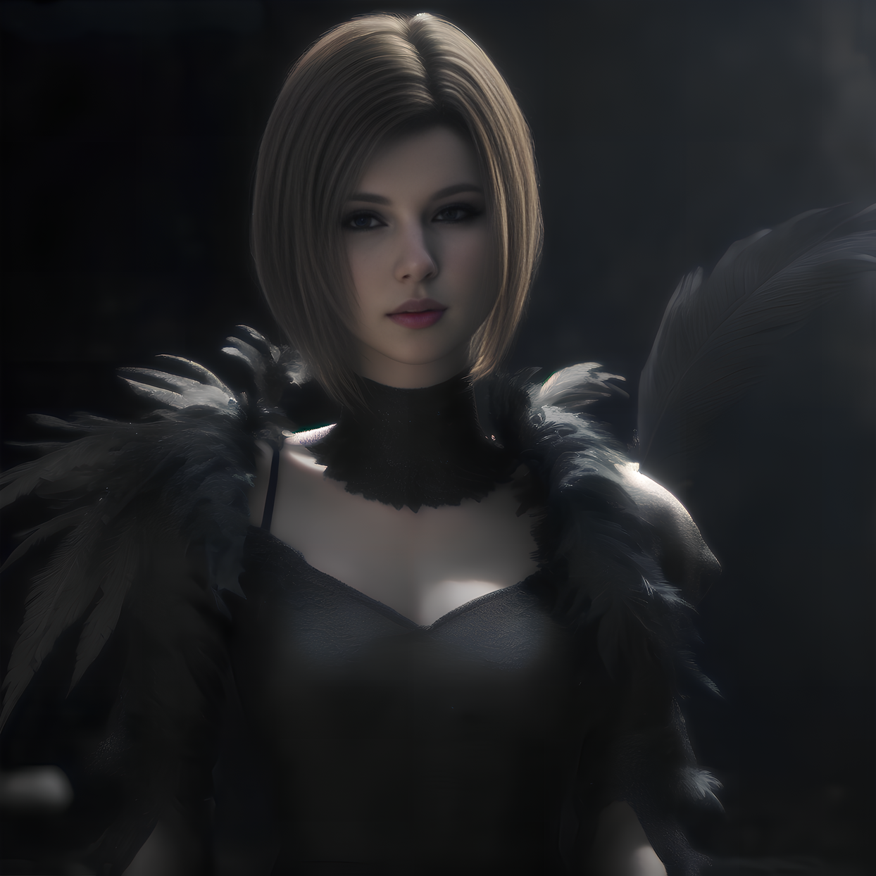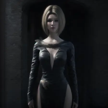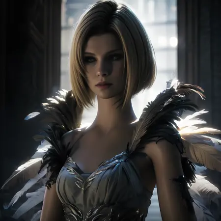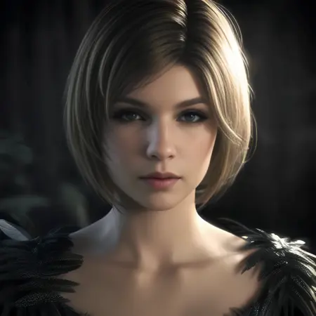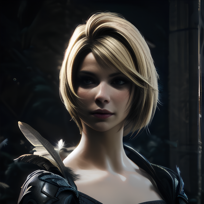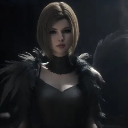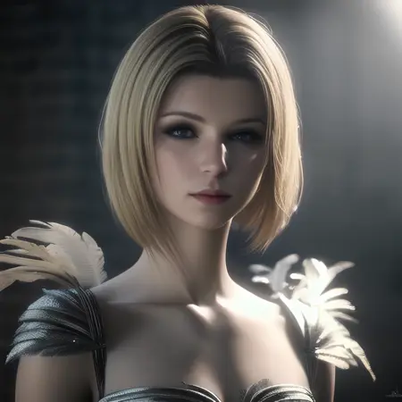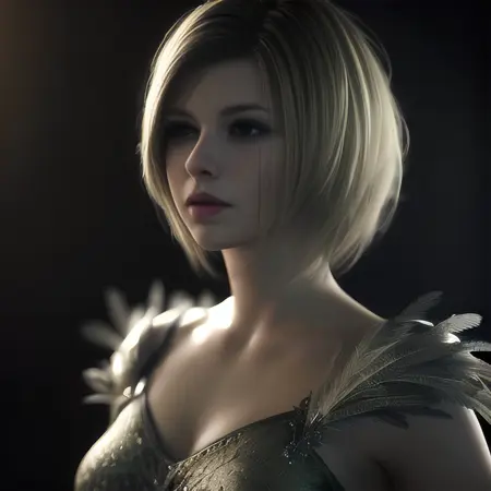 The activation word is Benedikta Harman -- other helpful tags are - blonde/short hair, feather dress, leather outfit, upper body, facing viewer, [...]