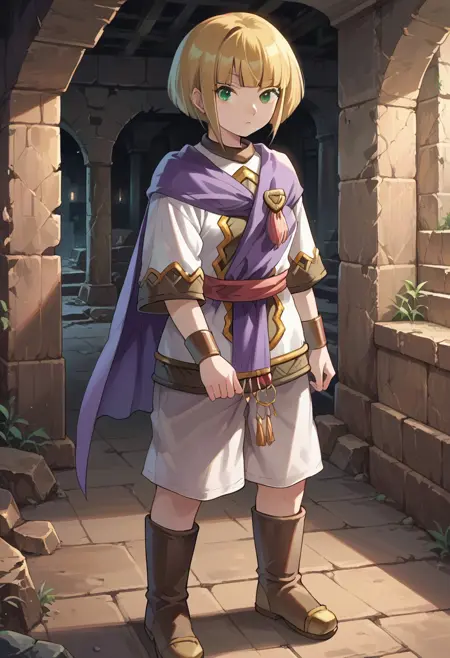 Tags: Sheba_GS, blonde hair, bob cut, blunt bangs, side locks, short hair with long locks, green eyes, cape, brooch, tunic, short sleeves, sash, bracer, white shorts, shorts, knee boots, brown footwear
