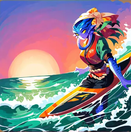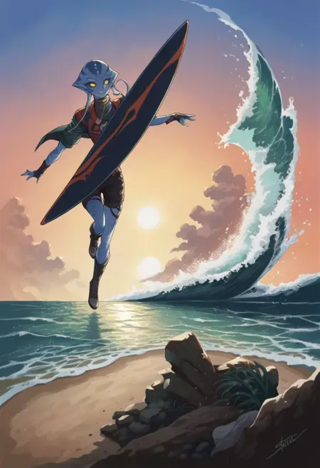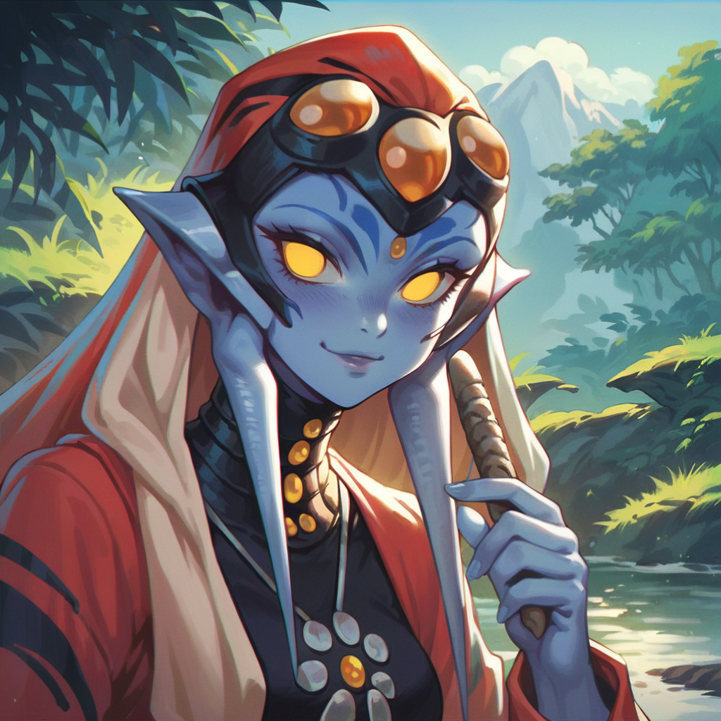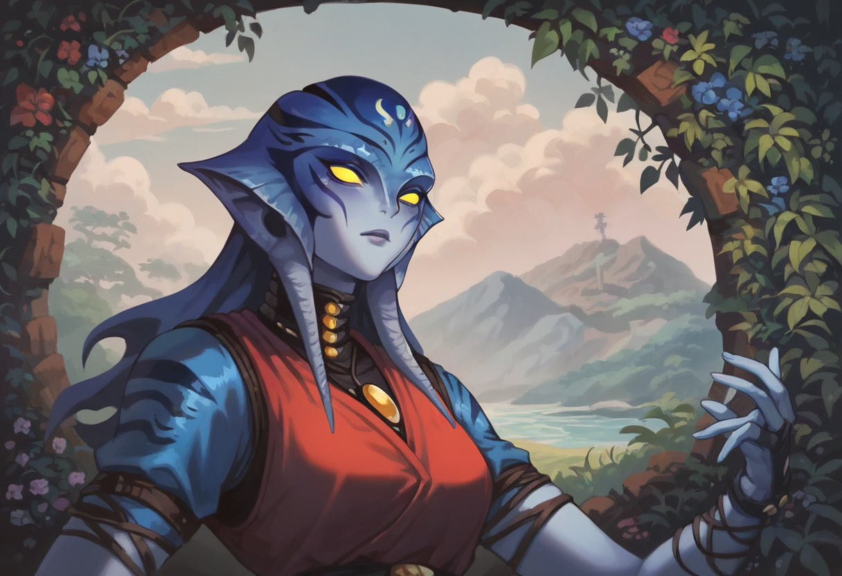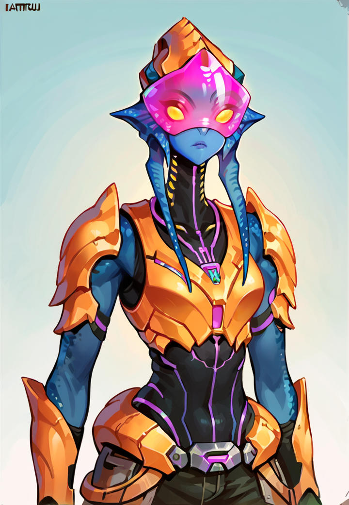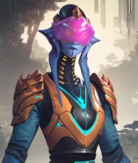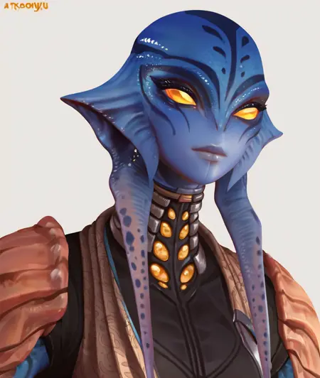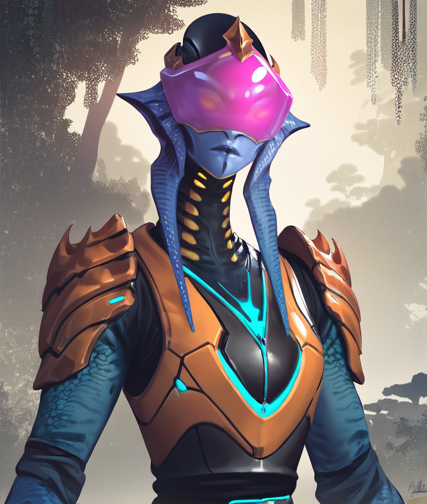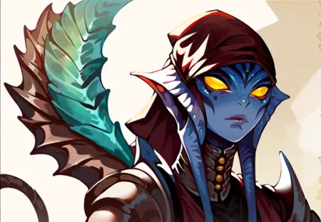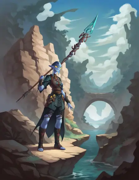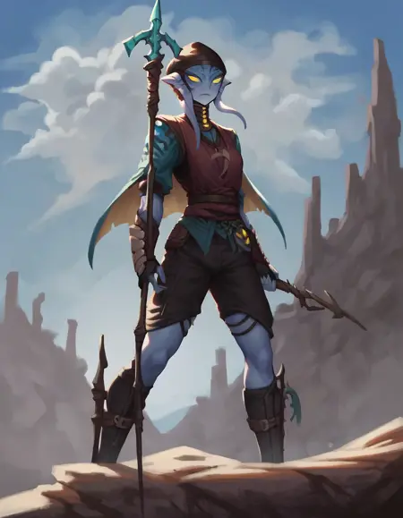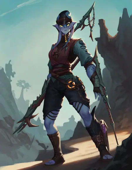 권장 프롬프트 - ajonahcur, 외계인 인류형, 동공 없음, 주름진 얼굴 특징, 노란 눈, 파란 피부, 창 무기