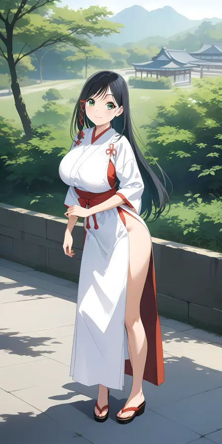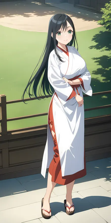 激活标签为 "amagami_yae, 1girl, green eyes, black hair, long hair, bangs, large breasts, red criss cross hair ornament,"