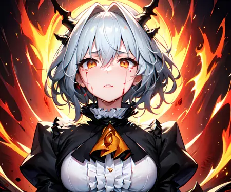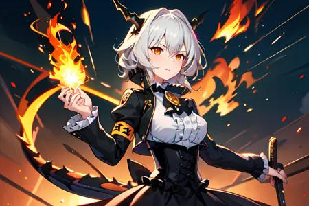 전체 트리거 단어: Ph_Talulah, dress T, long dress, 1girl, solo, long sleeves, dress, bangs, dragon horns, grey hair, hair intakes, frills, black ascot, hair between eyes, short hair, black dress, parted lips, breasts, white shirt, dragon girl, orange eyes, underbust, black jacket, medium breasts, armband, black skirt, juliet sleeves, open jacket, center frills, puffy sleeves, brooch, dragon tail