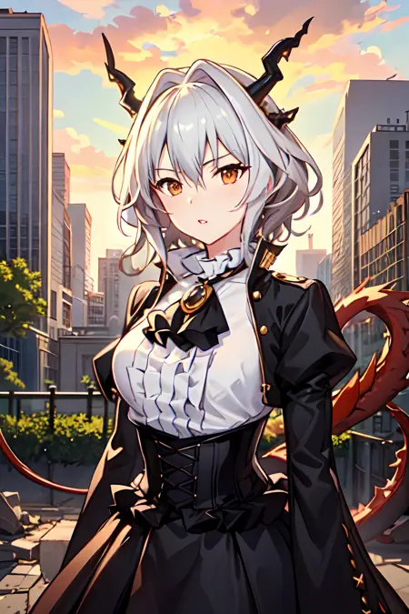 모든 트리거 단어: Ph_Talulah, dress T, long dress, 1girl, solo, long sleeves, dress, bangs, dragon horns, grey hair, hair intakes, frills, black ascot, hair between eyes, short hair, black dress, parted lips, breasts, white shirt, dragon girl, orange eyes, underbust, black jacket, medium breasts, armband, black skirt, juliet sleeves, open jacket, center frills, puffy sleeves, brooch, dragon tail