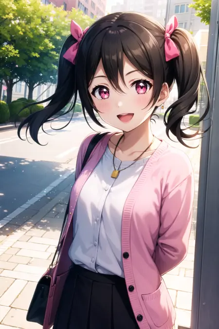 你需要的标签:1girl, solo, yazawa nico, 双马尾, (红眼睛), 黑发, 发带, 单侧发缕,