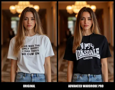 This workflow stands out as the best outfit customizer due to its exceptional attention to detail, blending seamlessly with the original image and retaining natural textures and lighting. Ultimate Wardrobe Pro offers a high level of adaptability, producing results that are lifelike and well-suited for professional applications.