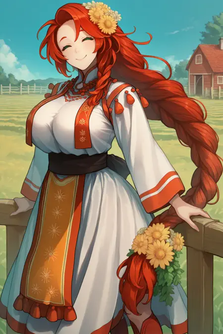발렌타인 데이 대체 버전을 원할 경우 "valTtna, 빨간 머리, 녹색 눈, 머리 꽃, 땋은 꼬리, 흰 드레스, 타바드, 스카프, 긴 소매, 빨간 부츠"를 추가하세요.