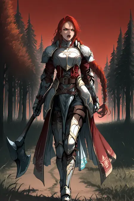 일반 외모를 원할 경우 "dfttna, 빨간 머리, 녹색 눈, 땋은 꼬리, 갑옷, 어깨 갑옷, 빨간 코트, 장갑, 벨트, 골반 커튼, 바지, 갑옷 부츠"를 추가하세요.