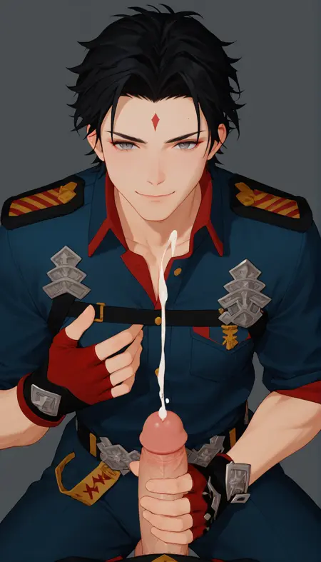 suggest: black hair, braid, grey eyes, forehead mark, military uniform, red fingerless gloves,