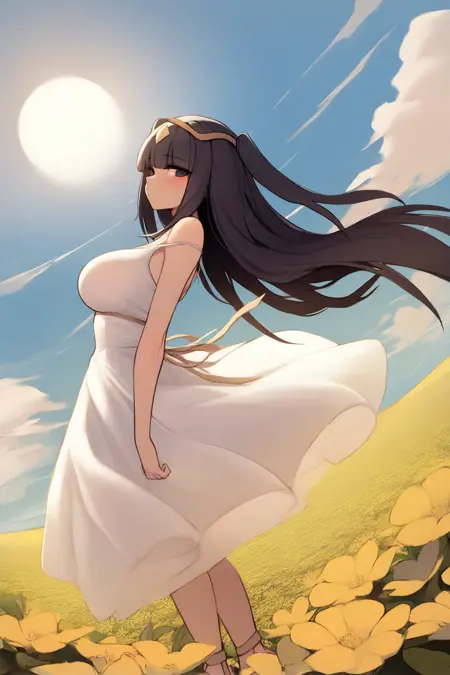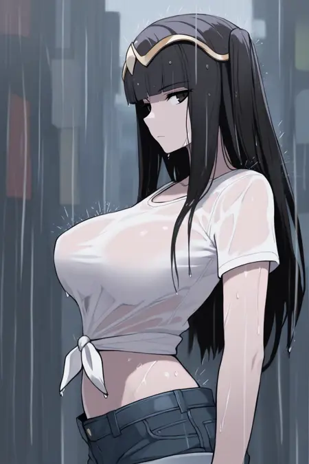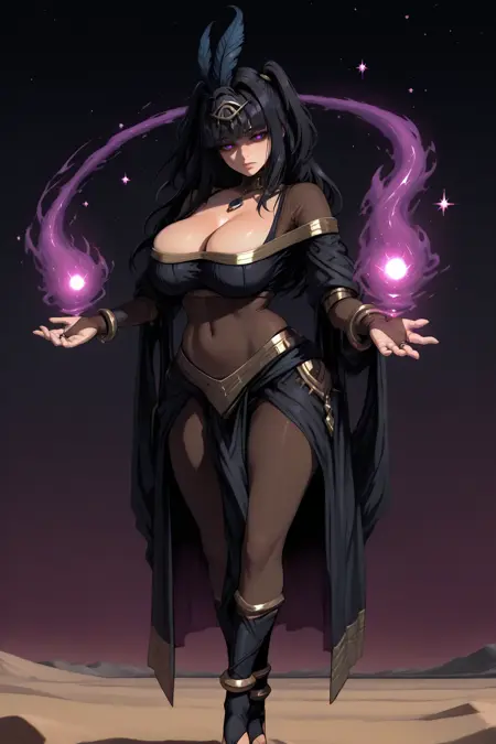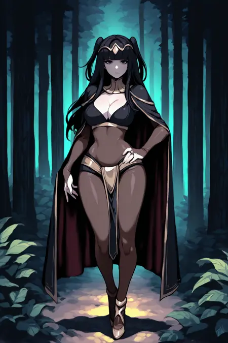 Add "defthj, black hair, two side up, long hair, blunt bangs, purple eyes, gold tiara, black cape, two-sided cape, gorget, bodystocking, bridal gauntlets, gold bracelet, black crop top, cleavage, black pelvic curtain, thighlet" for her regular look.