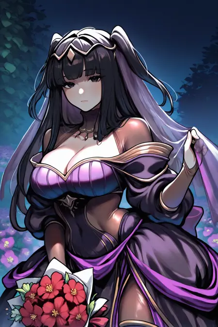 Add "brdthj, black hair, two side up, long hair, blunt bangs, purple eyes, gold tiara, bridal veil, neck ring, black gown, wedding dress, feather trim, purple sash, cleavage, bridal gauntlets, bodystocking, see-through skirt" for Bridal Tharja.