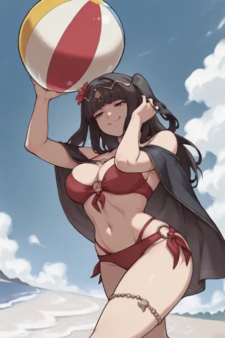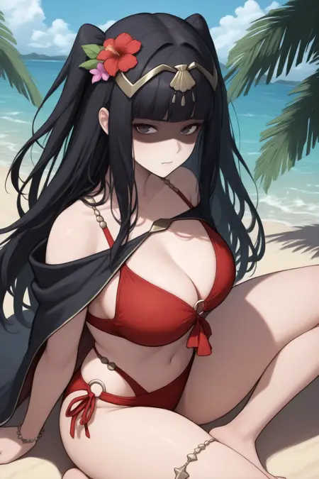 Add "sumthj, black hair, two side up, long hair, blunt bangs, purple eyes, tiara, hair flower, seashell hair ornament, black capelet, bare shoulders, red bikini, o-ring bikini, side-tie bikini bottom, flower bracelet" for Summer Tharja.
