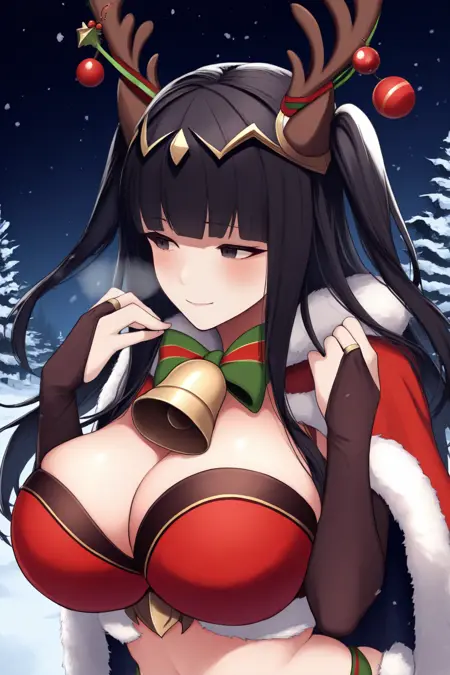 Add "wntthj, black hair, two side up, long hair, blunt bangs, purple eyes, gold tiara, fake antlers, red cape, fur-trimmed cape, striped bowtie, green bow, neck bell, santa bikini, bridal gauntlets, fur-trimmed thighhighs, black thighhighs" for Winter Tharja.