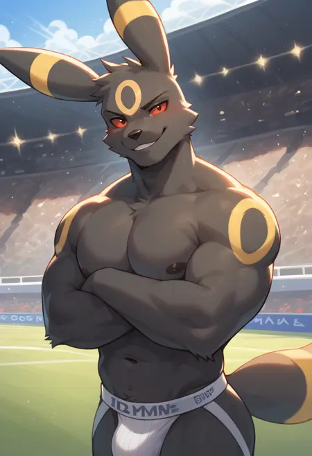 注意: 在生成雄性 Umbreon 时,由于训练数据以女性为主,即使使用了雄性标签,仍可能生成女性角色。可通过添加 "pecs"(胸肌)或其他雄性标签来修正,例如:muscular male(健壮男性)、((male))、(1boy)、slim male(瘦削男性)等……
