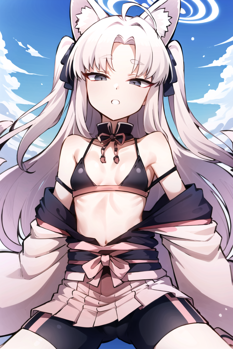 권장 프롬프트: kuzunoha, 긴 머리, 동물 귀, 하얀 머리, 작은 가슴, 일본 복장, 양측 올린 머리, 회색 눈, 여우 귀, 환상, 바이크 셔츠