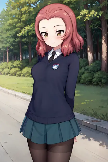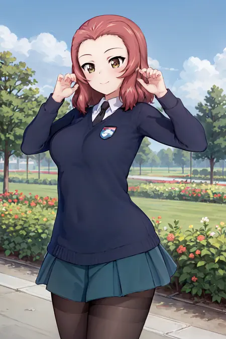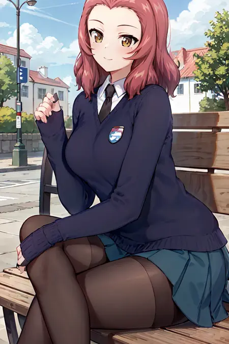 st. gloriana's school uniform, blue sweater, blue skirt, black necktie, white shirt, black pantyhose, st. gloriana's \(emblem\),