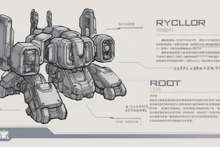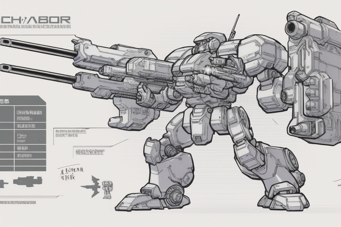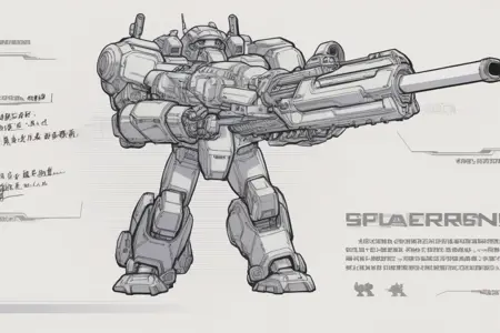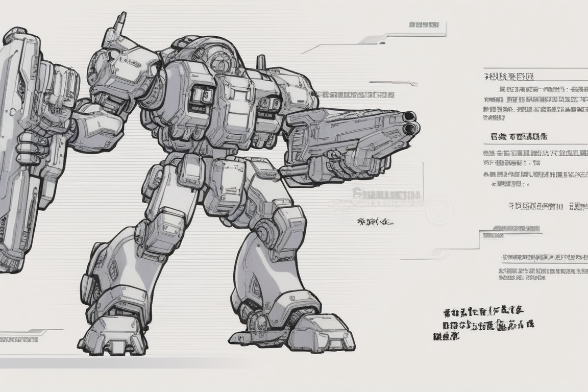 mechs and monsters, robot, monochrome, science fiction, no humans, mecha, solo, weapon, holding, machinery, cable, gun, holding weapon, standing, concept art, greyscale, arrow (symbol), 1other, chinese text