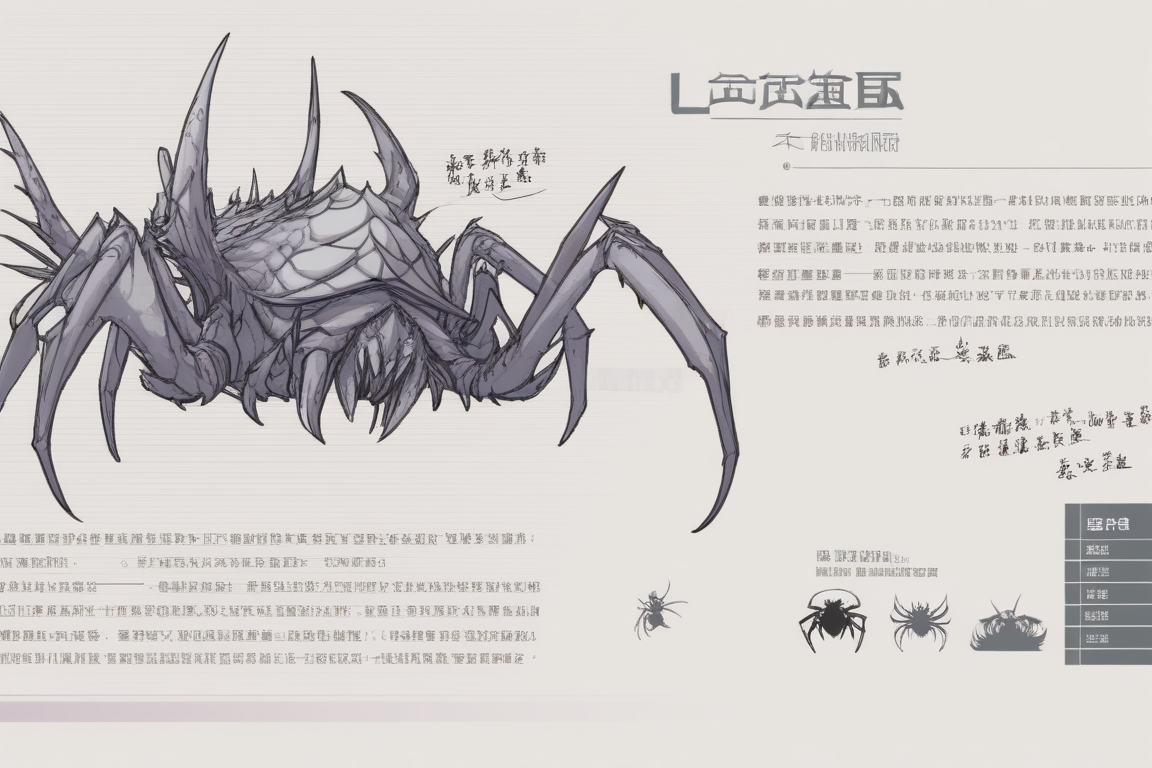 mechs and monsters, no humans, spider, chinese text, monster, monochrome, extra eyes, spikes, teeth, grey background, sharp teeth, bug, claws, wings