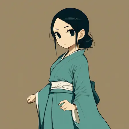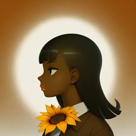 ビンテージのトースト感のある茶色に青緑のアクセントを加えたアニメ風肌のポートレート。金色のヒマワリの花々を用いた温かみのある色調。