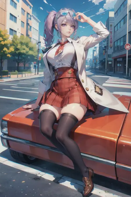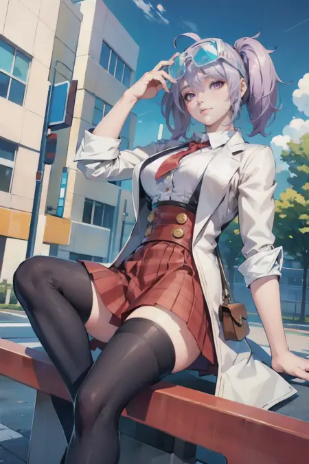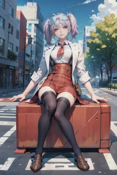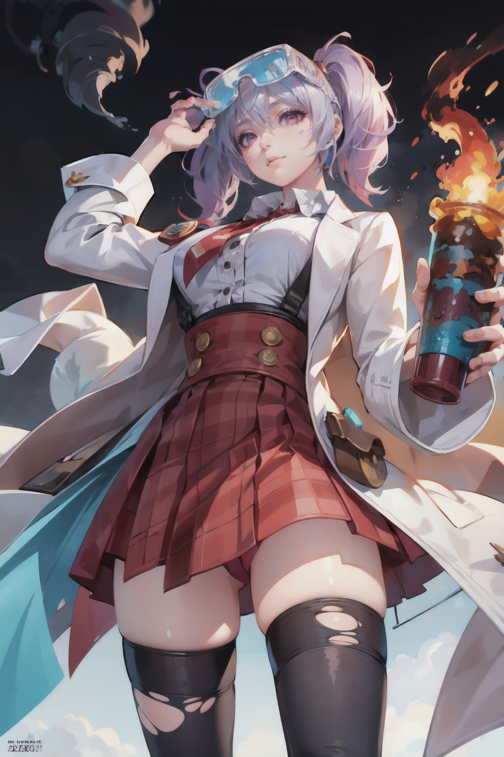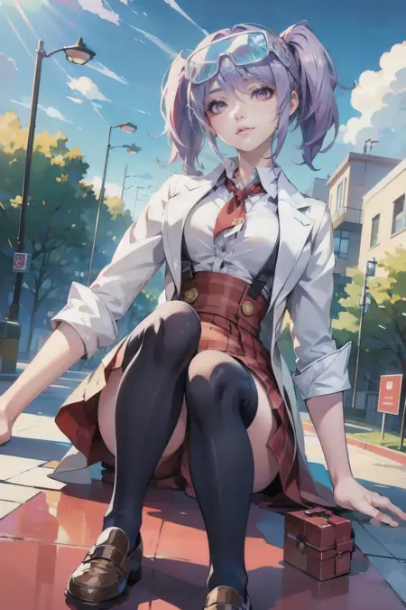 提示词:, Capheny_EX#524, 1girl, solo, twintails, eyewear on head, goggles, goggles on head, purple hair, hair ornament, pink eyes, labcoat, open coat, shirt, white shirt, necktie, red necktie, breasts, long sleeves, suspenders, skirt, red skirt, plaid skirt, high-waist skirt, thighhighs, black thighhighs, zettai ryouiki, shoes, brown footwear
