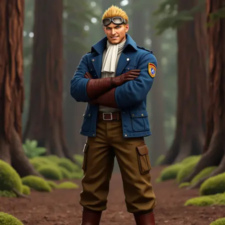 『リバース』のシド: rebirthcid, blue denim jacket, brown leather belt, brown leather boots, brown pants, leather aviator gloves, light grey shirt, light skin, long sleeves, white scarf