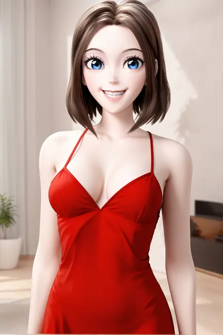 1girl, young, 20yo, pale skin, slim body, solo, beautiful, lltssam, looking at the viewer, blue eyes, brown hair, moles, render, smile, medium breasts, standing, beautiful,