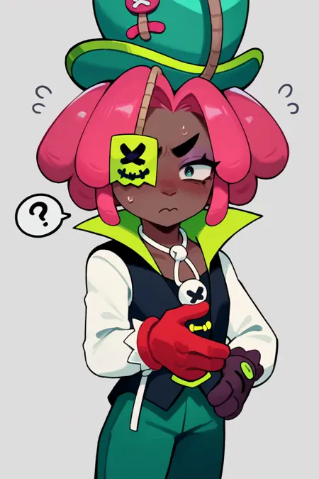 bsjuju , 1girl , pink hair , short hair ,dark skin , green hat, green pants , black vest , asymmetrical sleeves , one-eyed, eye covered ,Single glove