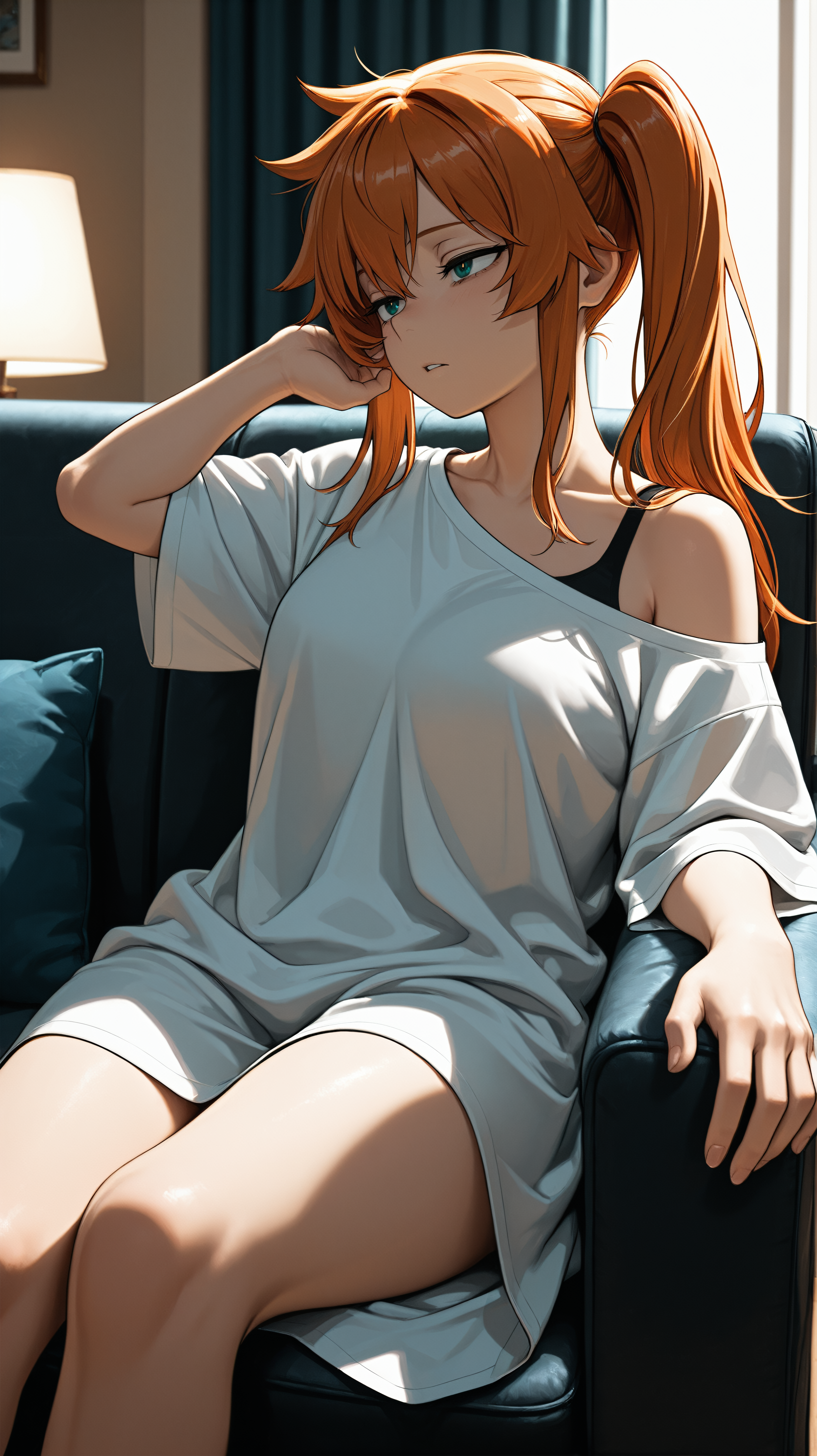 long hair, orange hair, side ponytail, green eyes, school uniform, white collared shirt, red necktie, green skirt, pleated skirt, black socks, knee-high socks, susuit4,
