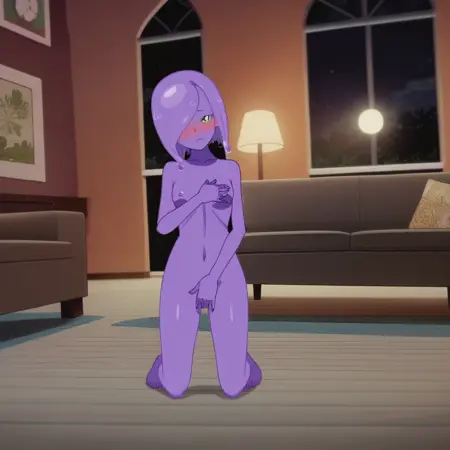 Main character tags: miasmaslime, monster girl, purple skin, slime girl, medium breasts, short hair, purple hair, green eyes
