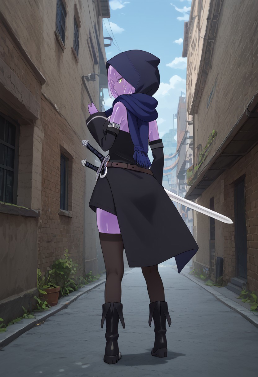 Clothing: black dress, belt, scarf, hood, detached sleeves, thighhighs, boots