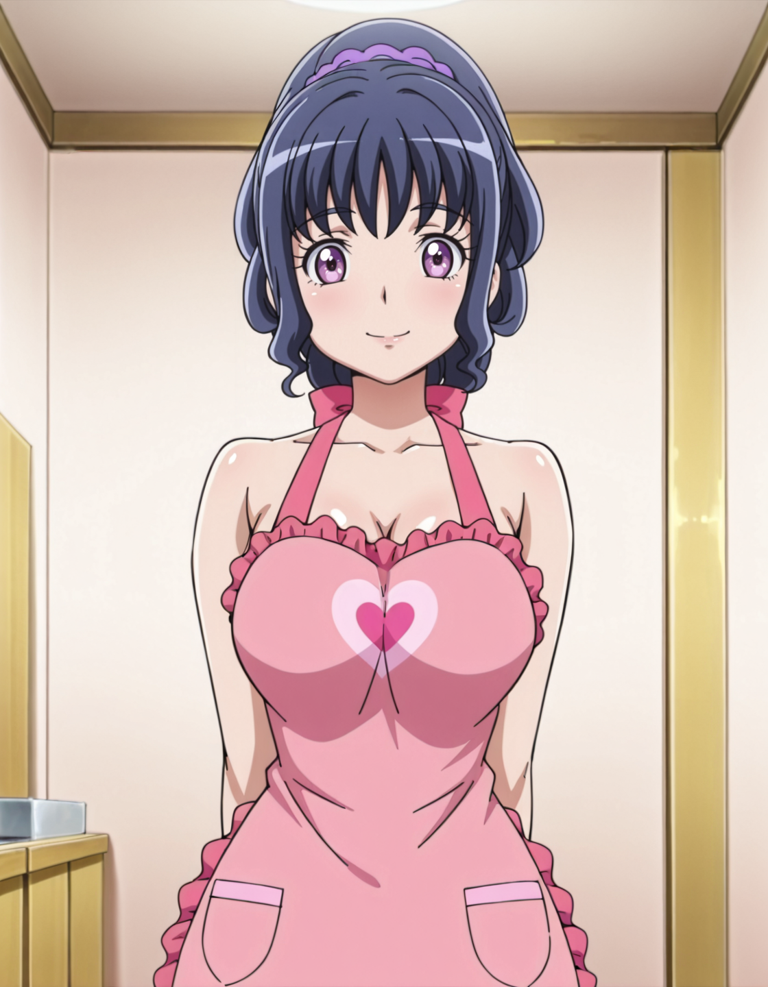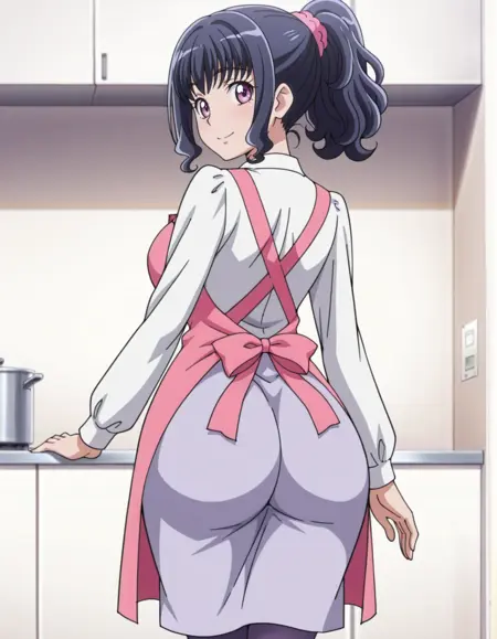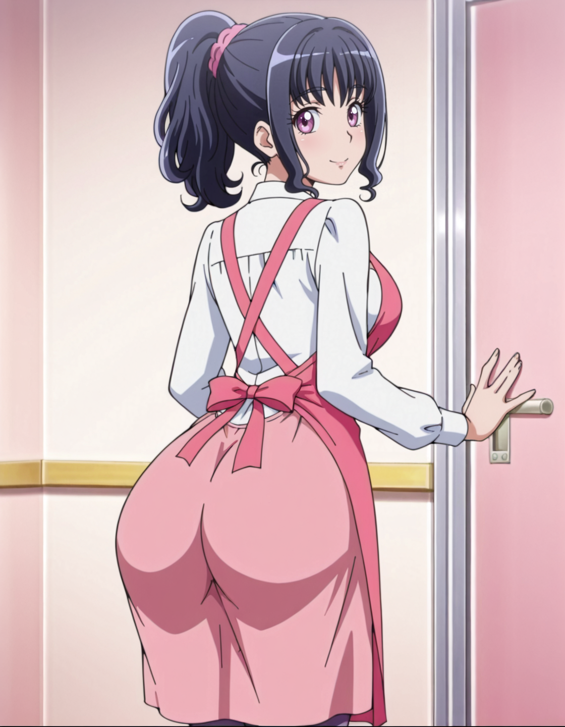 score_9, score_8_up, score_7_up, anime screencap, solo, 1girl, dress, pink apron, smile, black hair, ponytail, pantyhose, long sleeves, lora:minaminomisora:0.8