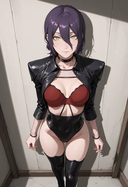 recommended tags: leotard, tight jacket, cropped jacket, black jacket, red bra cup, fishnets, black footwear, thigh boots, black thighhighs,