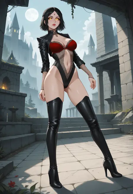 추천 태그: 레오타드, 타이트한 재킷, 크롭된 재킷, 검은 재킷, 빨간 브라 컵, 피시넷, 검은 신발, 허벅지 부츠, 검은 허벅지 양말,