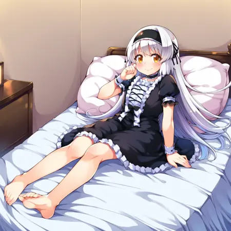 onesama,yellow eyes,long_hair,blush,looking at viewer,wrist_cuffs,white hair,hairband,black_dress,lolita_hairband,, huge penis, futanari, onesama_dark_balls, onesama_dark_penis