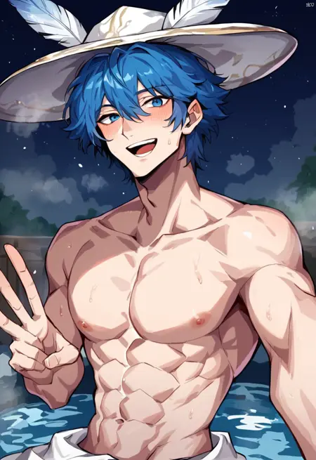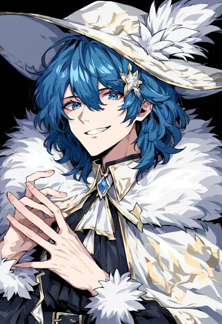 blue pants, pants tucked in, blue shirt, belt, white ascot, white cape, white hat, hat feather, fur trim, black gloves, black knee boots