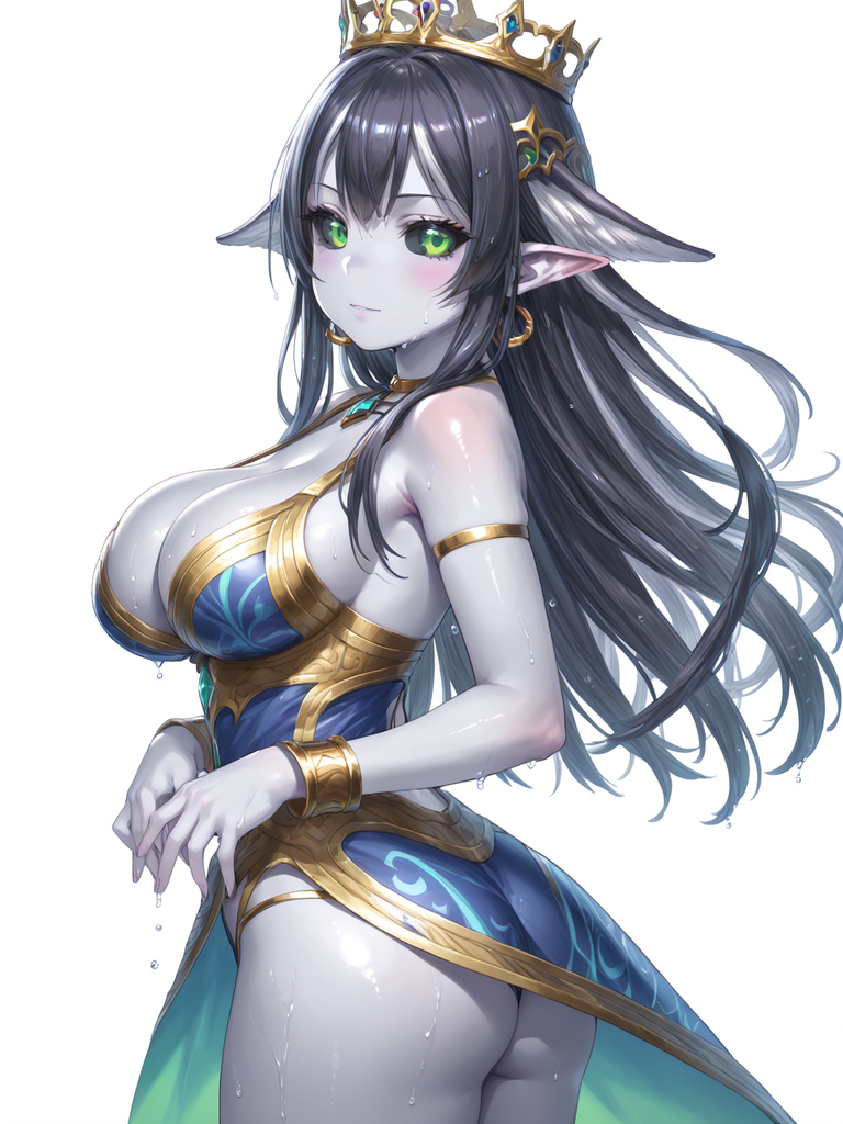 yasha wisp, colored skin, green eyes, black sclera, streaked hair, long hair, white hair, black hair, two-tone hair, multicolored hair, pointed ear,