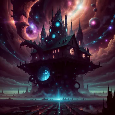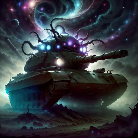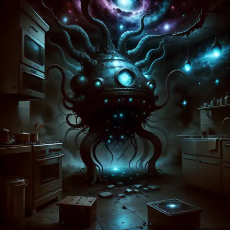 此 LoRA 会将其周围的事物转化为宇宙恐怖与克苏鲁式造物,展现人类探索并拥抱自然禁忌一面后所诞生的宇宙克苏鲁科技的时间线。