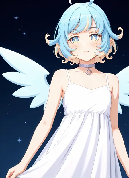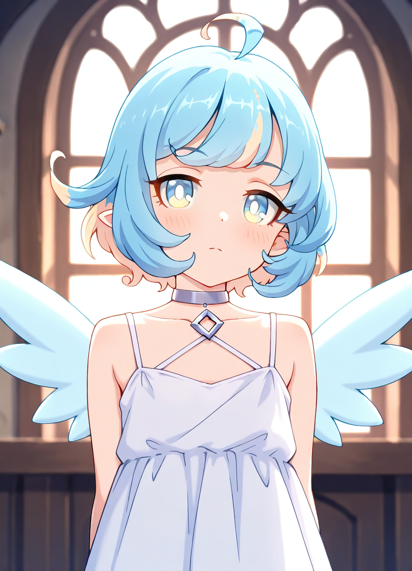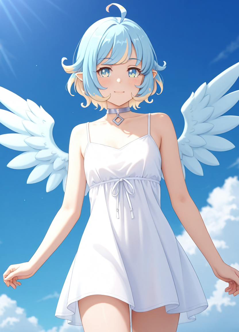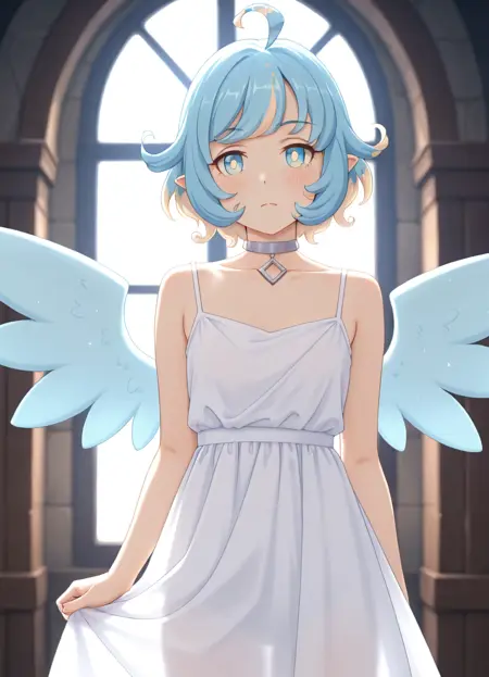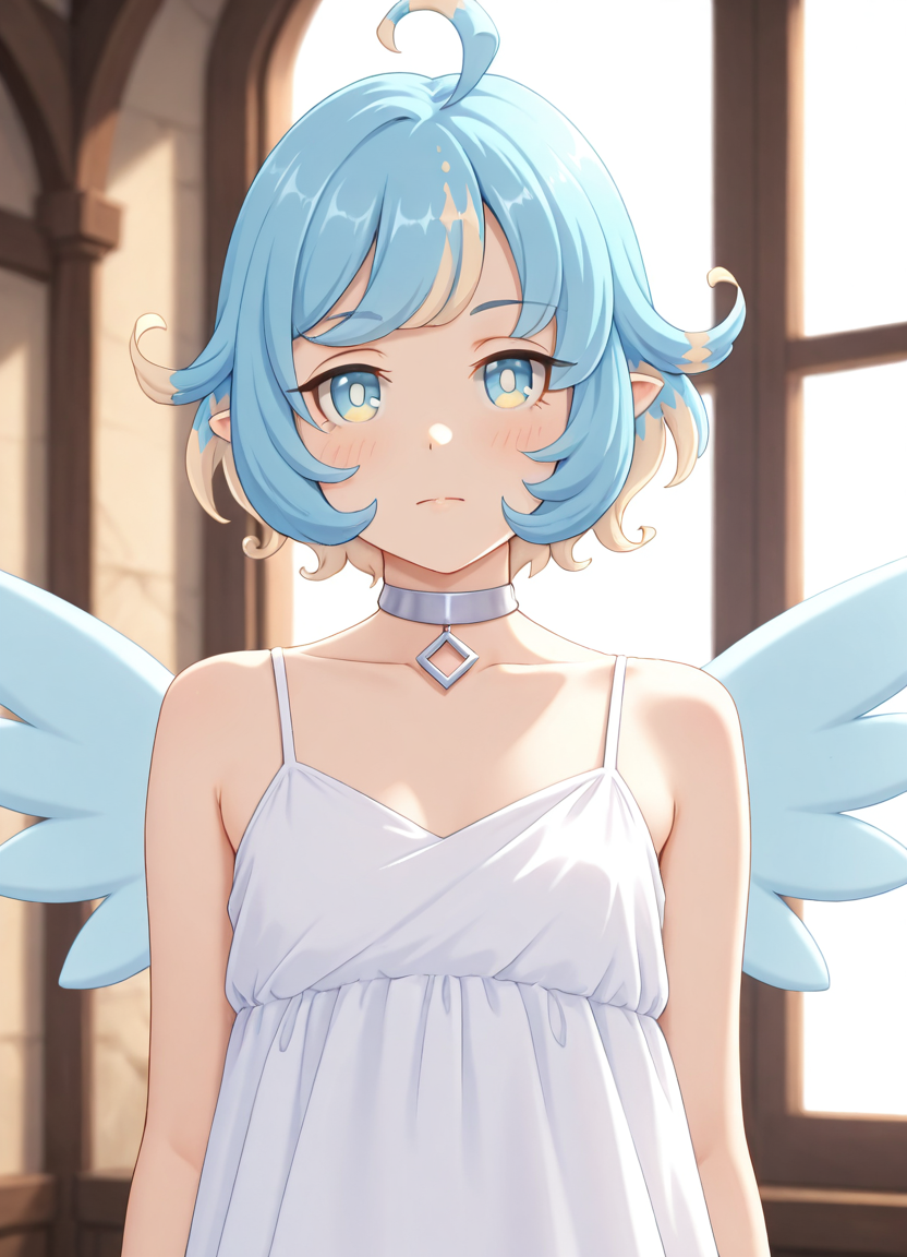 amy_(princess_connect), 1girl, 날개, 싱글, 아호게, 단발, 파란 머리, 다색 머리, 날카로운 귀, 흰 드레스, 드레스, 초커,