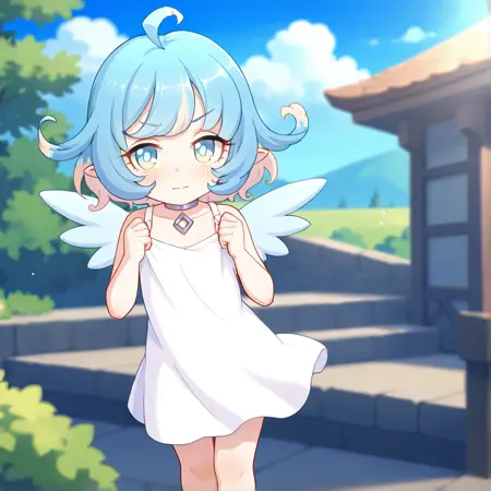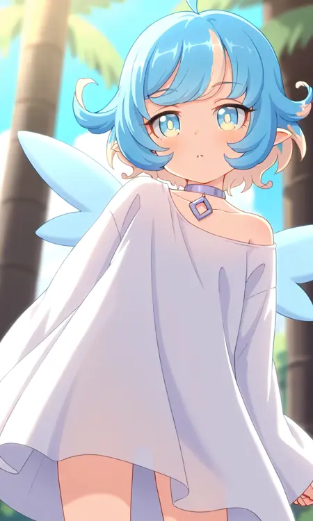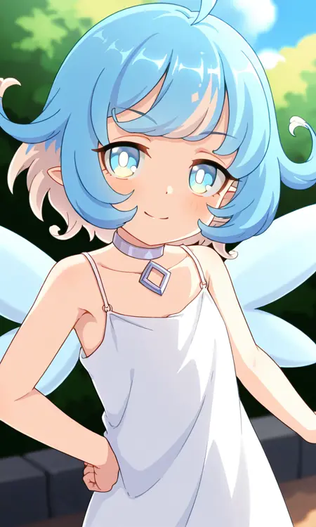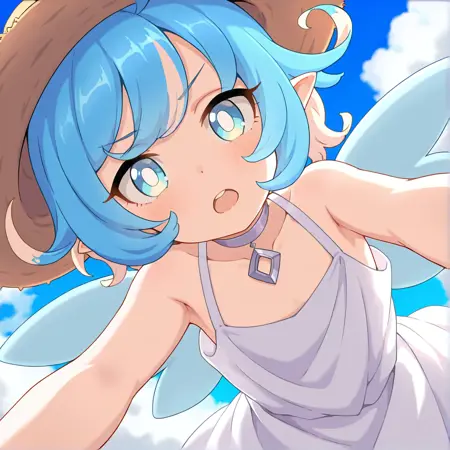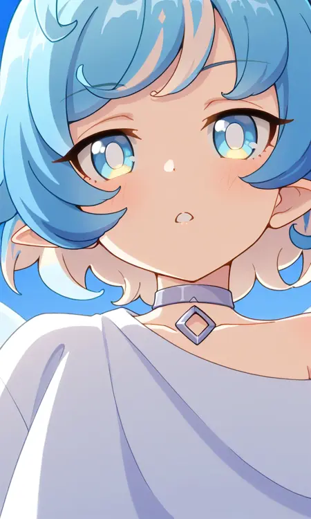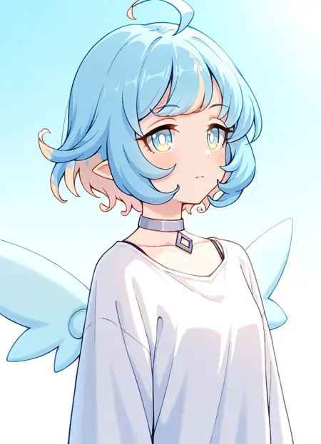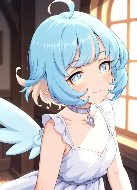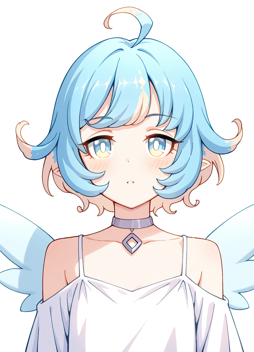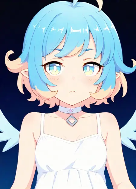 amy_(princess_connect), 1girl, 날개, 싱글, 아호게, 단발, 파란 머리, 다색 머리, 날카로운 귀, 흰 드레스, 드레스, 초커,