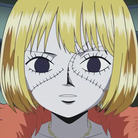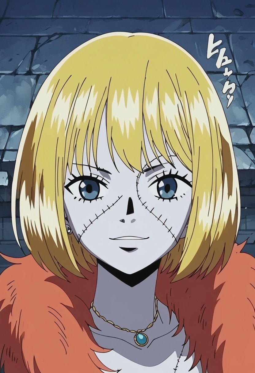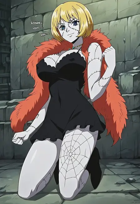 VictoriaCindryOP, 1个女孩, 单人, 僵尸, 怪物女孩, 短发, 金发, 彩色皮肤, 无神的眼睛, 苍白蓝色皮肤, 大乳房, 乳沟, 嘴唇, 珠宝, 项链, 短裙, 黑色裙子, 晚礼服, 缝合线, 波波头, 红橙色毛皮围脖, 高跟靴, 纹身, 板状物, 蜘蛛网纹身, 疤痕, 缝合的脸, 缝合的躯干, 缝合的腿, 缝合的手臂,