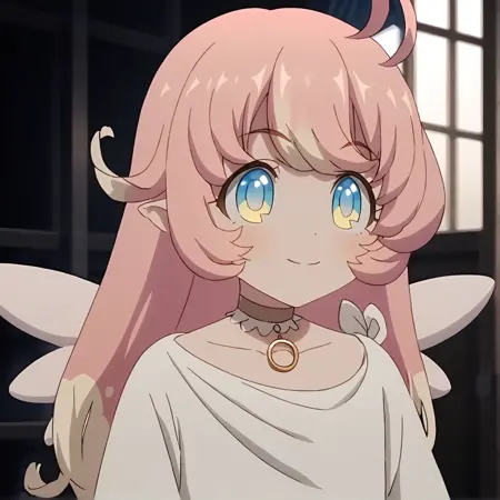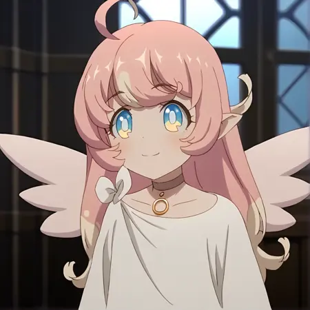 raphy_(princess_connect), 1girl, 长发, 粉色头发, 刘海, 多色头发, 尖耳朵, 蓝眼睛, 项圈, 翅膀,