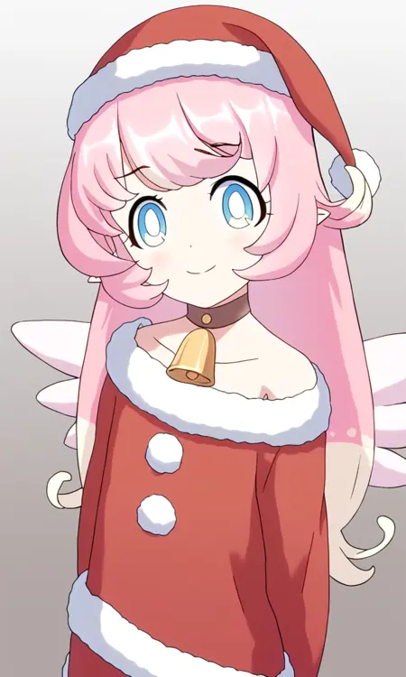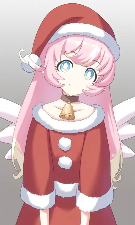 raphy_(princess_connect), 1girl, long hair, pink hair, multicolored hair, pointy ears, blue eyes, wings, wings, bell, hat, red headwear, santa costum, solo,