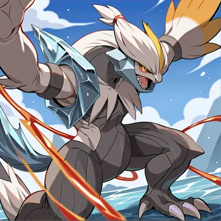 キュレムホワイト、ポケモン\(生物\)、人間なし、爪、黄色い目、牙、色のついた鞄膜、翼、灰色の皮膚、白い毛、氷