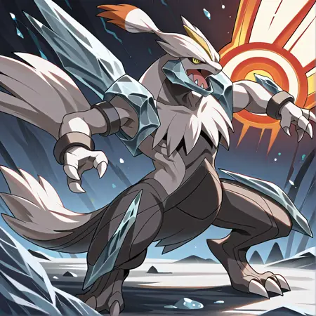 kyuremwhite, pokemon \(creature\), no humans, claws, yellow eyes, fangs, colored sclera, wings, gray skin, white fur, ice