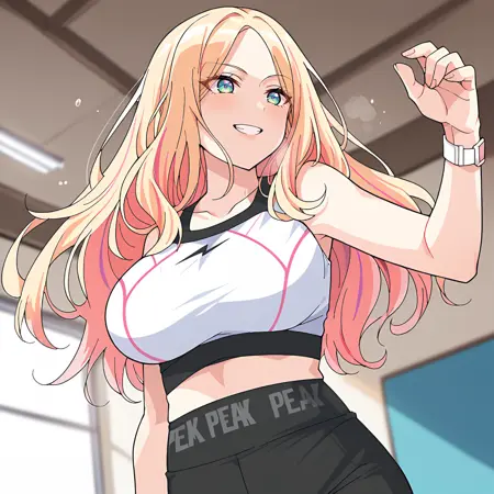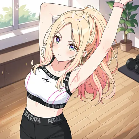 1girl, senajuo2idol, multicolored hair, sepe2 yoga pants, sepe3 sports bra, black sneakers, wristwatch