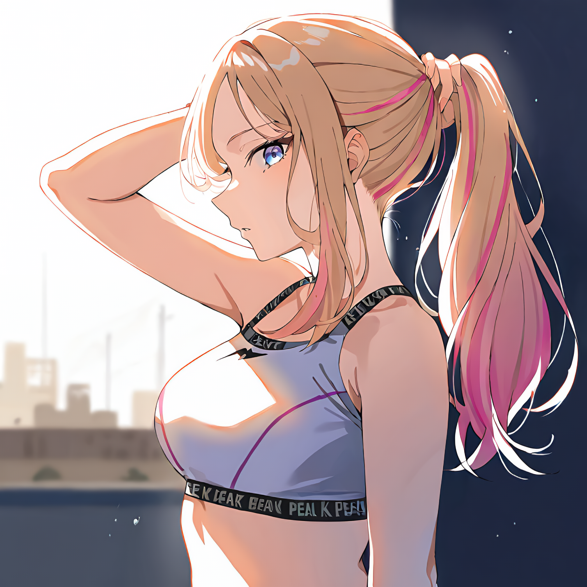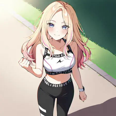 1girl, senajuo2idol, multicolored hair, sepe2 yoga pants, sepe3 sports bra, black sneakers, wristwatch