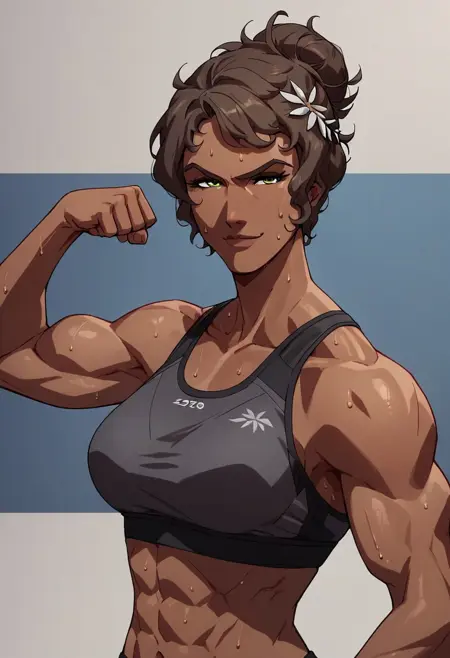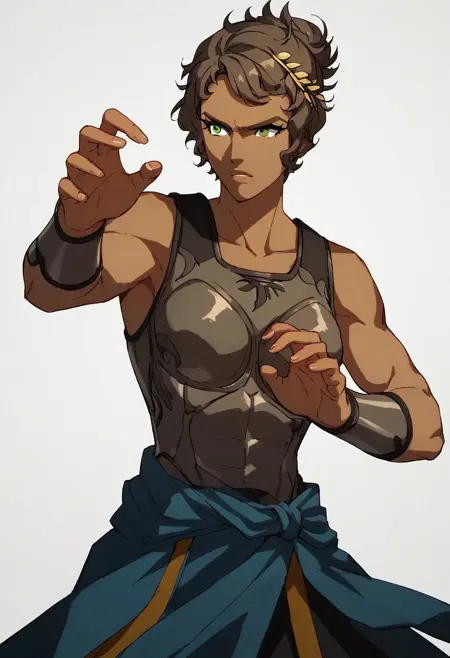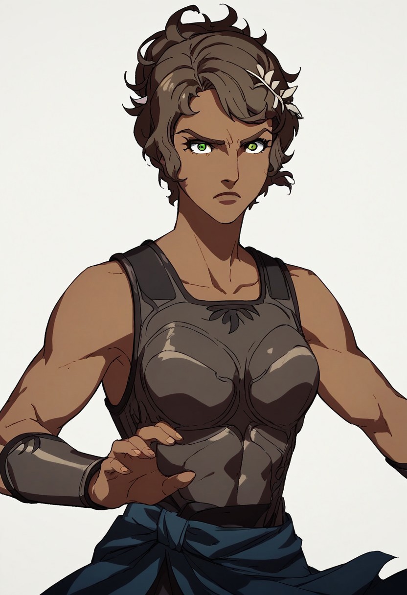 아테나 > 아테나, 검은 피부를 가진 여자, 녹색 눈, 갈색 머리카락, 짧은 머리, 가슴판