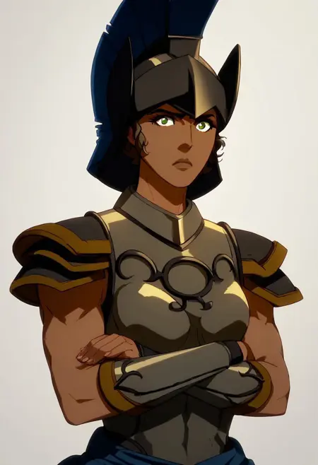 갑옷 입은 아테나 > 아테나, 검은 피부를 가진 여자, 갑옷, 헬멧, 녹색 눈, 갈색 머리카락, 앞머리
