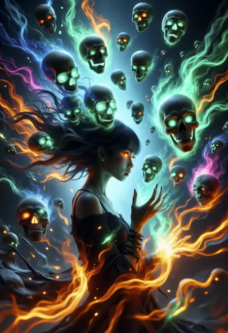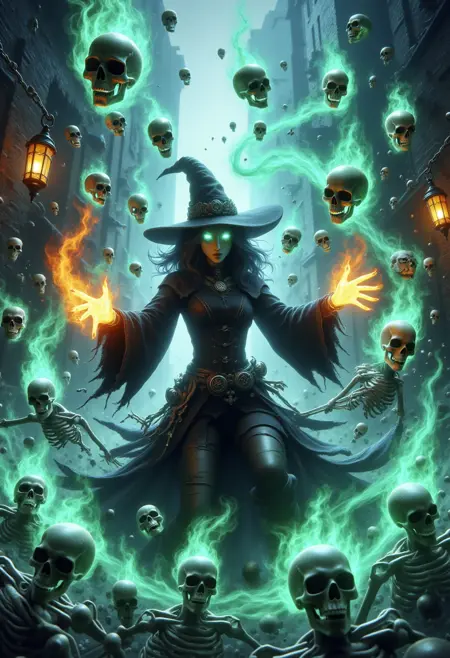 Trigger words: "skelewitch, a witch, casting spell, surrounded by flame-formed skulls and skeletons, ethereal aura, energy flow"